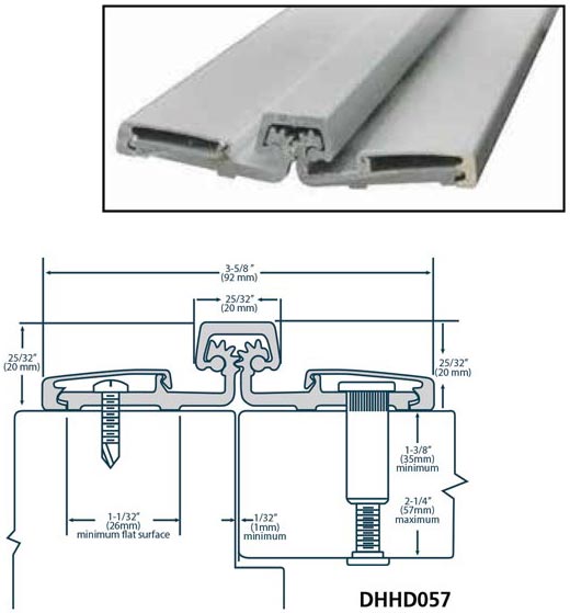 • DHHD057 is an Aluminum Continuous Geared Full Surface Hinge. It can be used with any standard frame without hinge preps, and either with or without reinforcements depending on door weight. The frame face must have a flat surface at least 1-1/32″wide. Clearance between the hinge edge of the door and the frame rabbet is 1/32″ (1mm). “HD” models have additional bearings and frame fasteners for heavy-duty application.